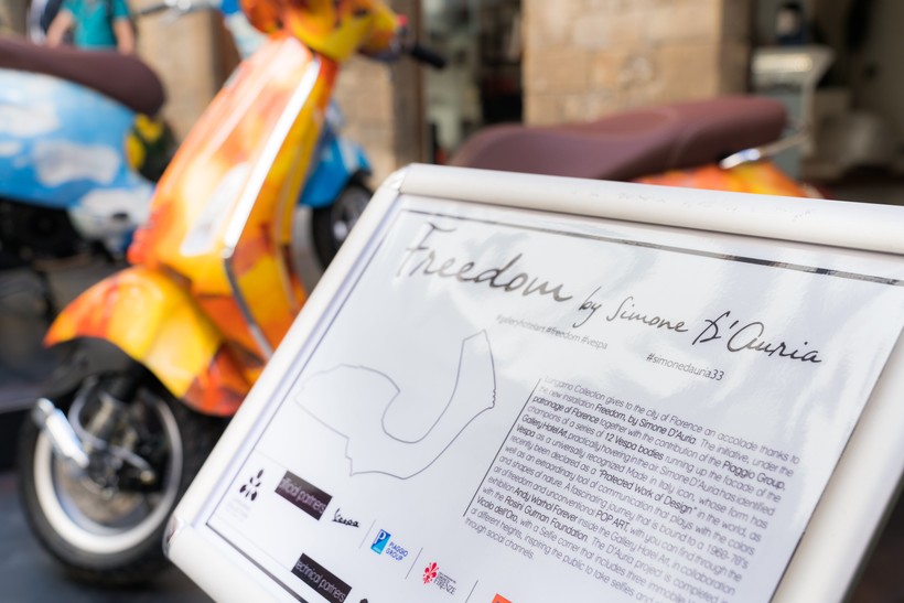 Одна из самых противоречивых фигур в истории современного искусства Энди Уорхол (Andy Warhol) вместе с набирающим силу итальянским талантом Симоне Д’Aуриа (Simone D’Auria) оказались на улицах Флоренции, чтобы принять участие в необычном городском проекте, задуманном Lungarno Collection. Без преувеличения культовые работы мастера американского поп-арта, объединенные с не менее узнаваемыми скутерами Vespa, облик которых был переосмыслен блистательным миланским художником в инсталляции под названием «Свобода» (Freedom) — это вдохновляющее путешествие по интерьерам и фасаду флорентийского дизайн-отеля Gallery Hotel Art. Он входит в коллекцию отелей Lungarno Collection, которая принадлежит семье Феррагамо.