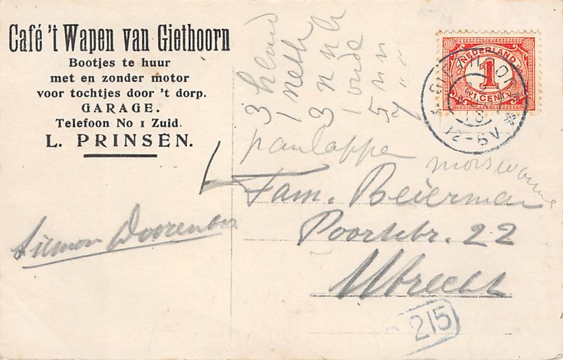 Хитхорн стал популярным туристическим направлением еще в конце 19 — начале 20 века. Об этом можно узнать из рекламных открыток того времени. 1910 год, реклама кафе Cafe ’t Wapen van Giethoorn Garage L. Prinsen