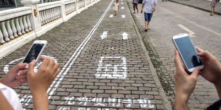 В Китае придумали специальные дорожки на тротуарах для людей, которые не могут оторваться от смартфонов. Таким образом, китайцы пытаются уберечься от неприятных инцидентов, столкновений и травм.