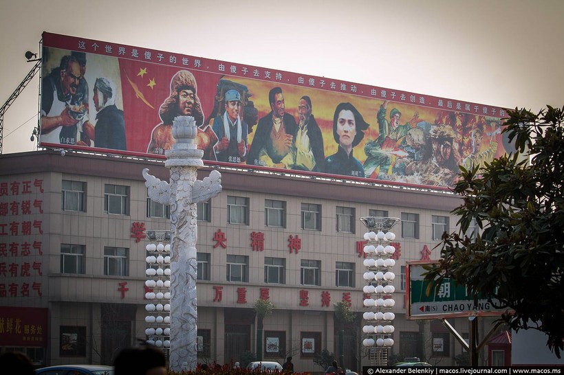 Плакаты смотрятся современно, их делали уже в наше время. Агитация повсюду. На каждой стене, в каждом окне. На площади стоят громкоговорители, транслирующие «Красный восток», гимн КНР времен «культурной революции».