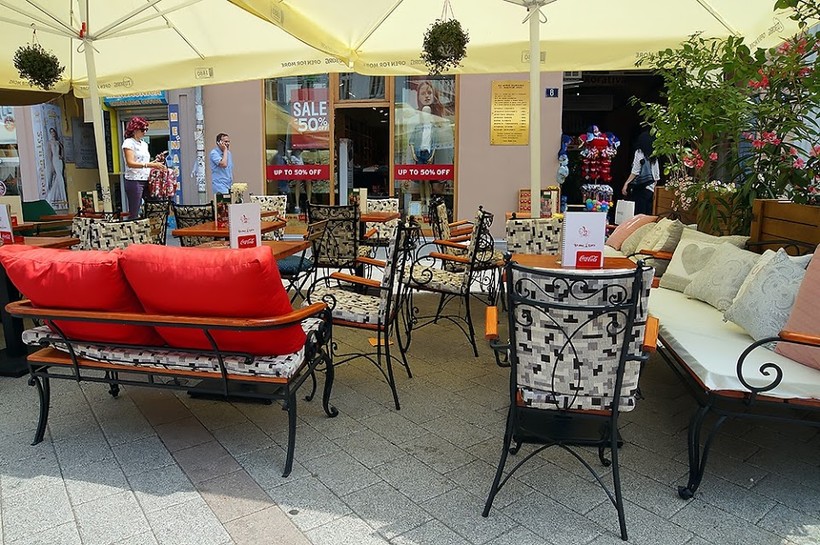 Между чистеньких европейского вида домиков перед нами убегала классическая пешеходная зона. Уютные кафешки. Яркие подушки. Сиденья-качели. Высокие диваны на витых ножках. Зонтики. Салфетки. Цветы.