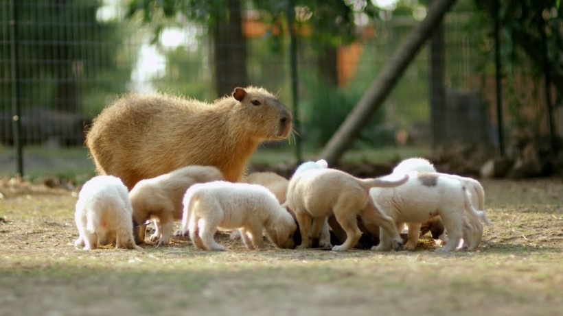 Капибары, обитающие в Центральной и Южной Америке, немного похожи на волосатых свиней без хвостов и пятачков. Грызуны достигают около 60 сантиметров в высоту, имеют слегка перепончатые ноги и, как правило, довольно социальны. Поэтому Чизкейк сразу стала играть, есть и спать с собаками. Когда появились щенки, материнские инстинкты капибары заработали в полную силу: она не отходила от младенцев ни на шаг, наблюдала за ними днем и учила их манерам. Интересно, что даже если щенки попадали в приют вместе с матерями, те спокойно доверяли капибаре своих малышей.