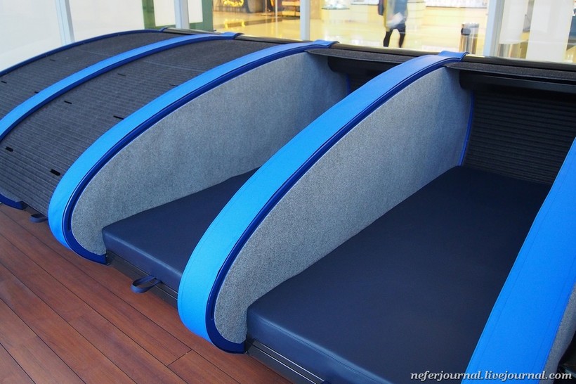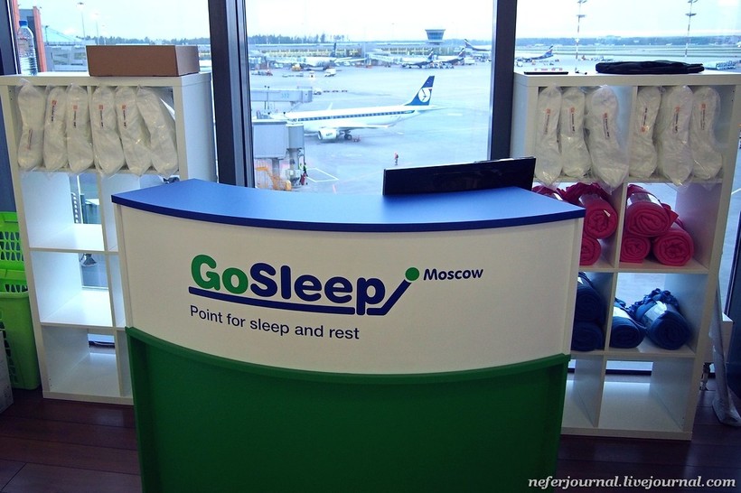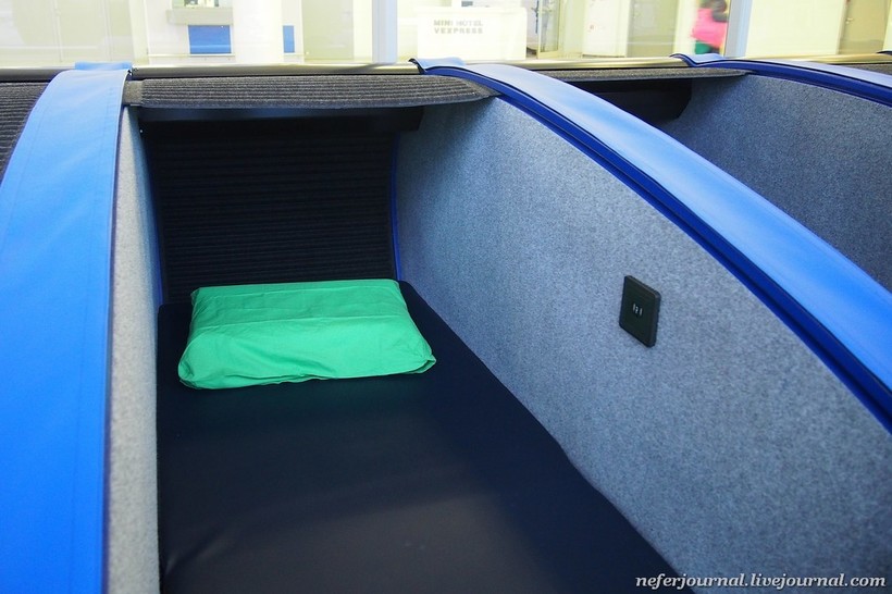 Точка называется GoSleep.Moscow и находится в терминале Е рядом с гейтом 36. В тот день они только открылись, велись последние приготовления. В анонсах написано, что это капсульный отель, на мой взгляд это немного некорректно. Смысл в том, чтобы получить удобное место для отдыха, где можно разместиться с комфортом или даже вздремнуть. Внутри капсулы имеется USB-порт и ящик для багажа. Предлагают пледы и ортопедические подушки. Похоже на условия бизнес-класса в самолете.