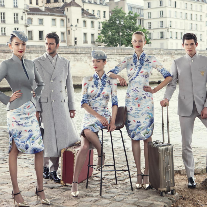 Над костюмами работал дизайнер Лоуренс Сю, он представил линию одежды на Неделе моды в Париже. На создание коллекции Лоуренса вдохновило традиционное китайское платье ципао. Новые наряды бортпроводников и пилотов совмещают в себе тенденции западного стиля и традиционные элементы китайского искусства, в том числе волны, облачные рисунки и даже изображения мифической птицы Рух.
