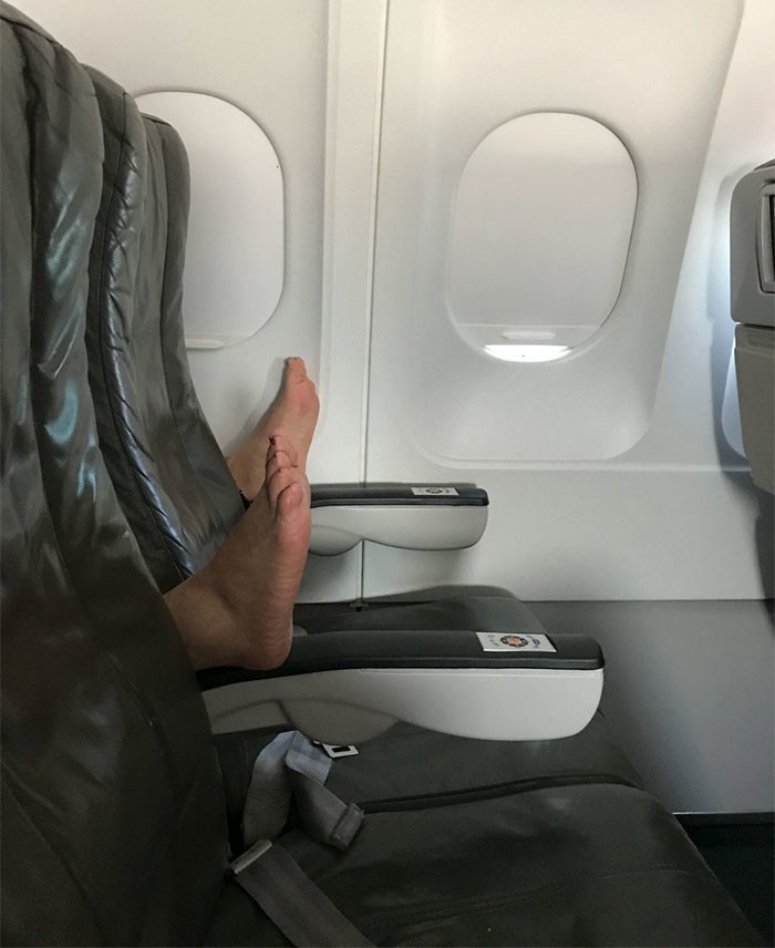 Но и это был не конец. Через несколько минут Джесси увидела, как этот человек открывает и закрывает возле нее окошко... своей ногой! После этого перелета Чарл считает, что не стоит начинать радоваться, если вдруг вы обнаружили, что летите один в целом ряду кресел. А чтобы быть более убедительной, девушка приложила фотографии.