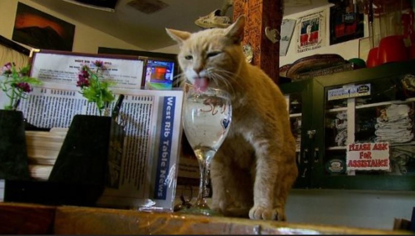 Стаббс пьет из бокала свой любимый напиток — воду с кошачьей мятой