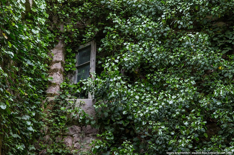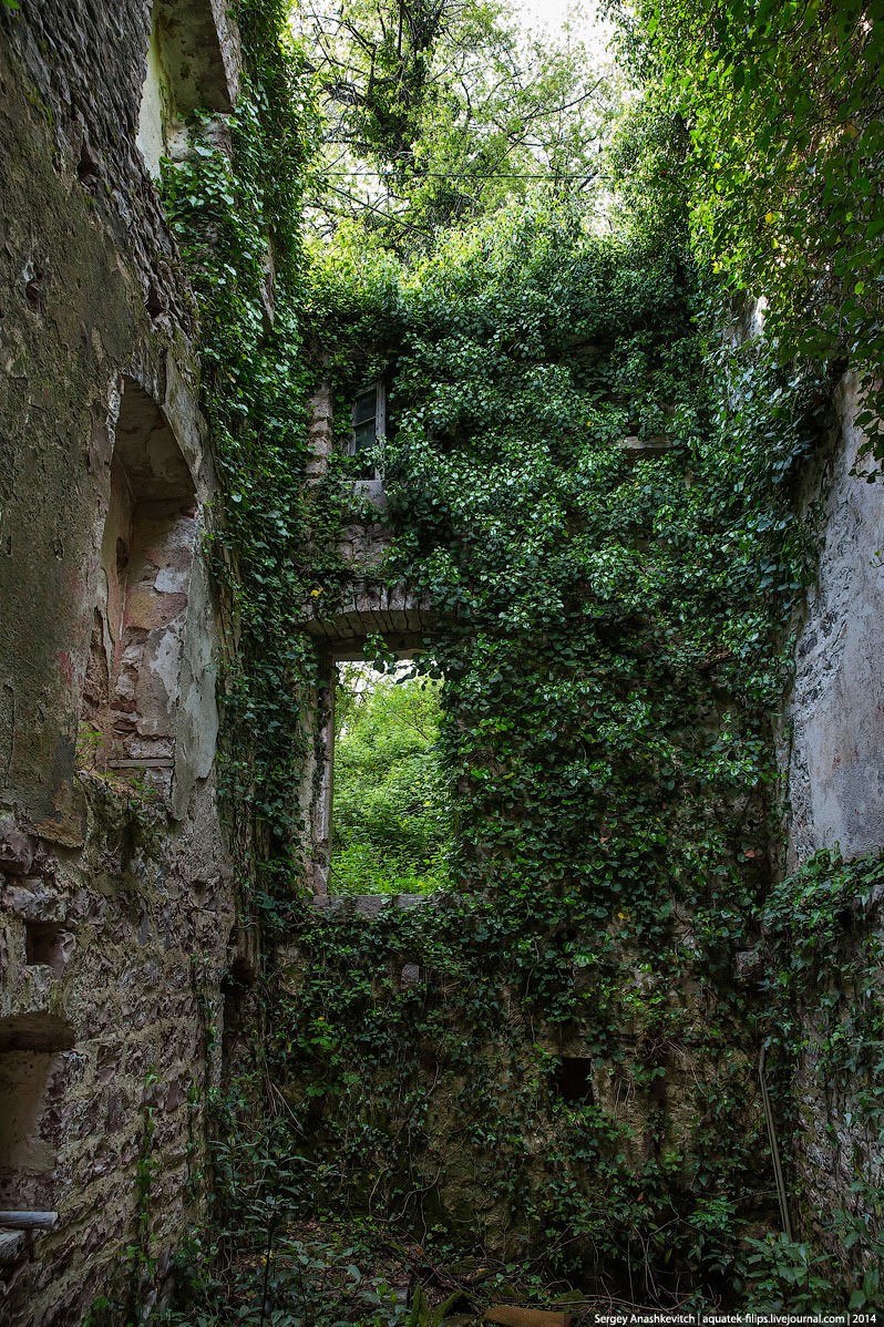 Внутри дома. Перекрытия давно разрушились и истлели на земле, а стены постепенно покрываются плющом: