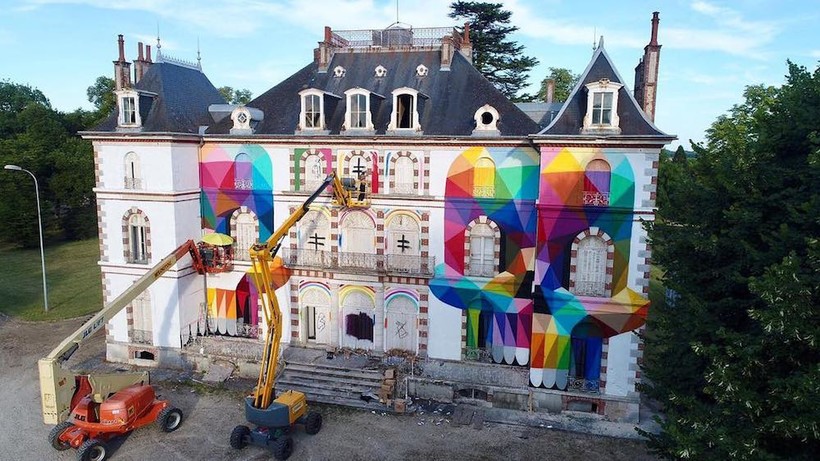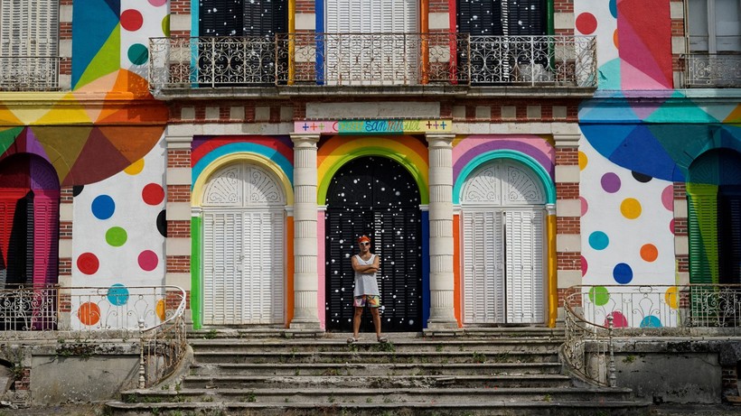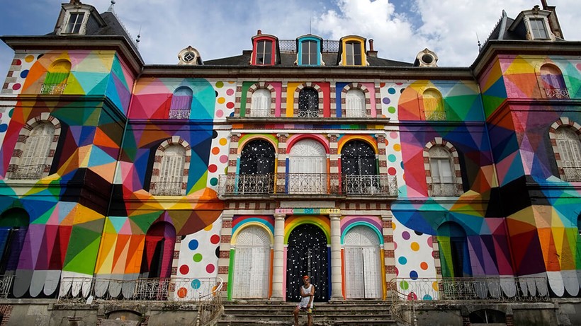 Испанского художника Окуда Сан Мигеля прозвали иконой поп-сюрреализма. Он уже раскрасил 100-летнюю испанскую церковь, превратив ее в скейт-парк, и в самом центре Парижа установил цветную вышку для прыжков в воду. Недавно художник закончил работу над французским замком Шато де ла Валетт.