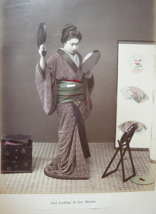 Гейша смотрит на свою прическу в зеркало