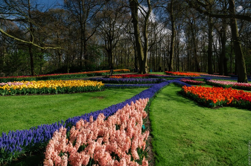 В общем, едем дальше. В парк Кёкенхоф. Обязательно весной, чтобы сделать селфи на фоне ковра, как в 90-х. С разницей лишь в том, что фотографироваться мы будем на фоне цветочного ковра, точнее ковров. Их здесь много. И все разноцветные. А еще есть клумбы, поля, оранжереи, инсталляции и декорации — все из цветов.