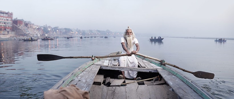 Священник-аскет Баба Виджей Нанд гребет на лодке вдоль реки Ганг. Варанаси, Индия