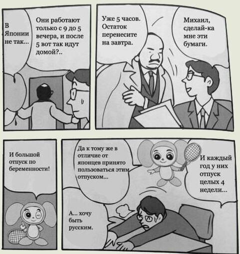 Помимо отпуска по болезни и ежегодного отпуска у русских есть отпуск по беременности и родам. Он, вообще, длится несколько лет, а женщины этим бессовестно пользуются, рожая детей одного за другим. Руководство страны потакает им и платит за второго ребенка 123 тысячи йен. Для русских это больше деньги.
