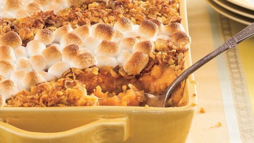 Сладкая картошка батат покрывается маршмэллоу и запекается.