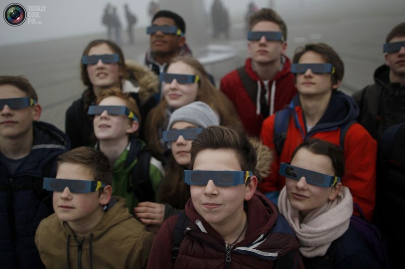 Ученики наблюдают за частичным солнечным затмением в специальных очках, Хертен, Германия