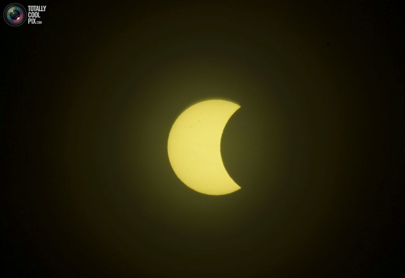 Луна загораживает солнце, производя частичное затмение в небе над Рейкьявиком.