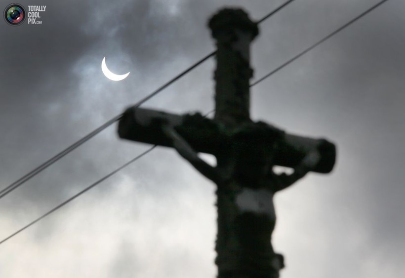 Частичное солнечное затмение видно сквозь тучи, Финистер, Франция