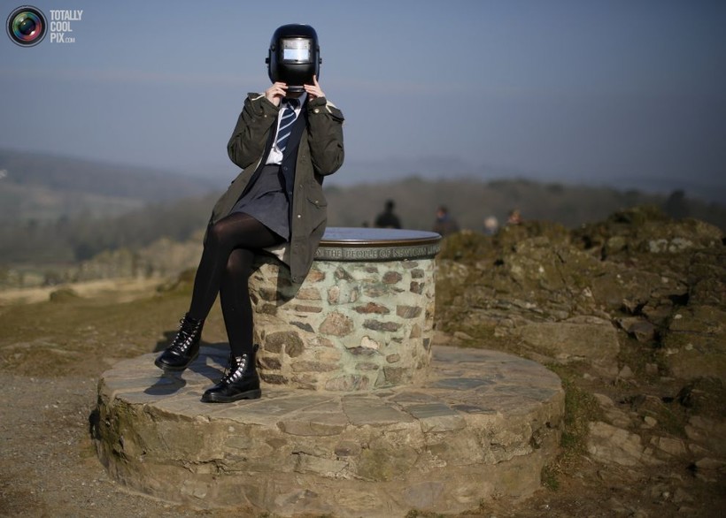 Девушка использует сварочную маску, чтобы наблюдать частичное солнечное затмение в Ньютаун-Линфорд, Англия