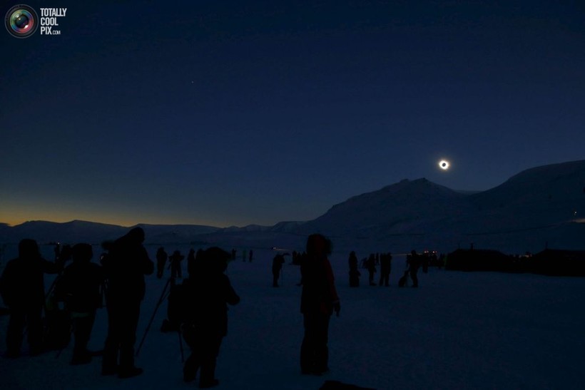 Люди наблюдают за полным солнечным затмением на Шпицбергене.