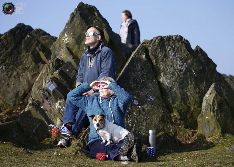 Люди наблюдают за частичным солнечным затмением в Ньютаун-Линфорд, Англия.