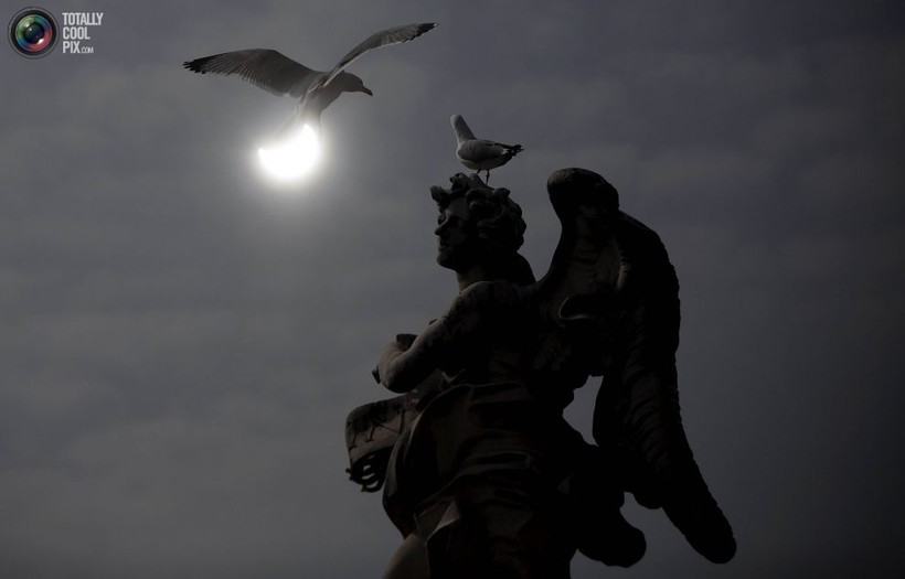 Частичное солнечное затмение над Мавзолеем Адриана в Риме, Италия.