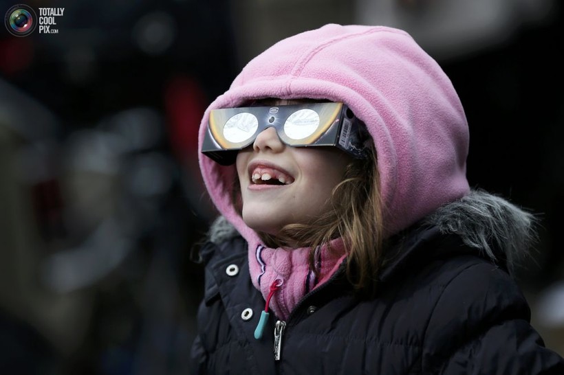 Девочка в защитных очках наблюдает за частичным солнечным затмением возле Королевской Обсерватории, Гринвич, Лондон