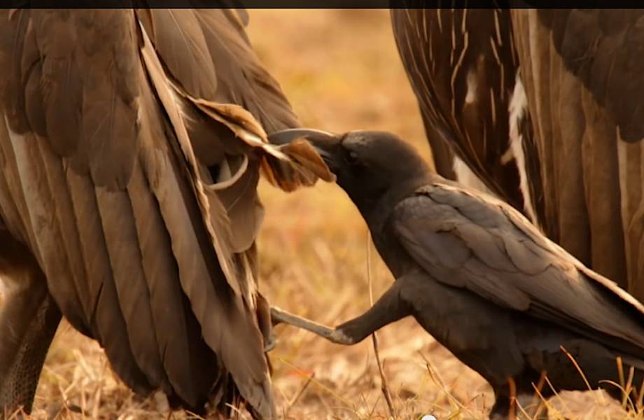 Очередной потрясающий ролик от ВВС. На сей раз его героями стали птицы-падальщики. Среди этих животных существует четкая иерархия, когда дело касается обеда. Но что остается делать маленькому ворону, который тоже был бы не прочь подкрепиться. Справить с целой стаей огромных грифов ему помогут только хитрость и ум. Чтобы получить свою порцию еды, смекалистая птица незаметно подходит к грифу сзади и выдирает перо из его хвоста, тот оборачивается и без раздумий набрасывается на своего собрата, стоящего позади. Когда вся стая рассорена, ворон пользуется моментом перепалки и может спокойно лакомиться добычей. Однако стоит на пиршестве появиться шакалу, как все его участники в миг замирают. Никакой конкуренции и интриг, все ждут, когда животное-падальщик насытится и позволит доесть за ним.