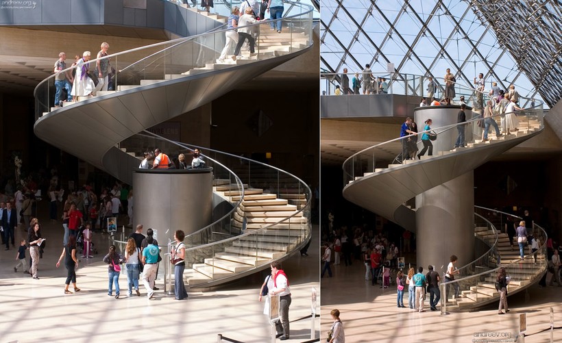 Его кабина с открытым верхом оборудована гидравлическим приводом, что позволяет тихо и плавно перемещать посетителей по Лувру, как будто вырастая из пола.
