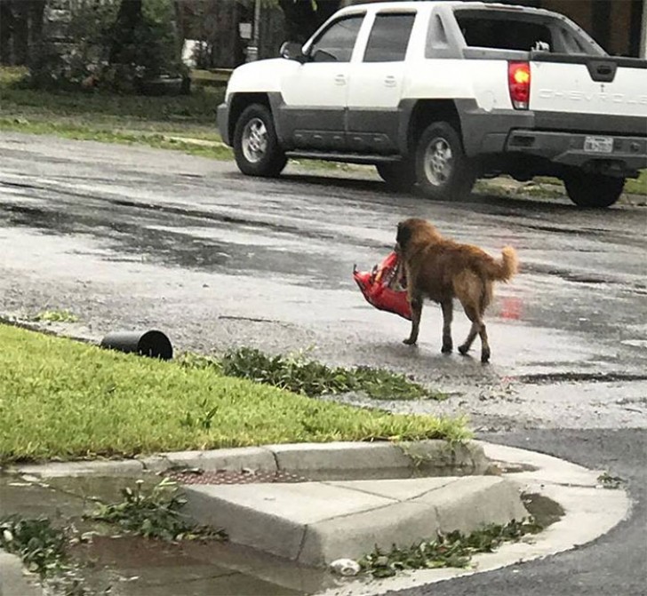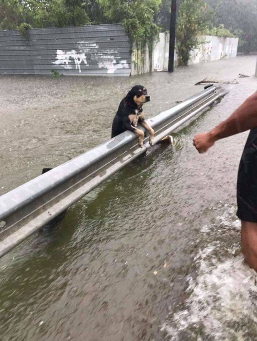 Собака пытается выбраться из воды во время наводнения в Хьюстоне. Она была спасена.