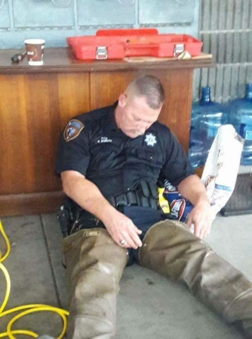 Этот полицейский работал бесчисленное количество часов подряд, помогая жертвам урагана, пока не свалился от истощения.