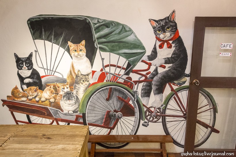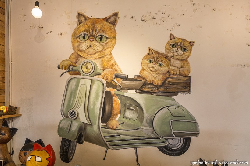 Набрели на кафешку-магазин, чья продукция полностью посвящена усатым и хвостатым: магнитики, фигурки, футболки, сумки, тарелки — все с котиками.