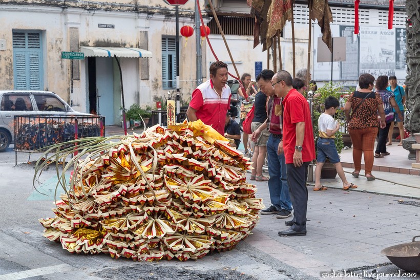 Оказавшись у красочного кланового храма с резными колоннами, мы застали одну из религиозных церемоний. В воздухе витал запах гари, смешивавшийся с ароматом тлевших благовоний. Рядом с перекрестком возвышалась гора украшений из бумаги, спустя мгновения вспыхнувшая и подогревшая и без того теплый пенангский воздух. Туристы разбежались в стороны от храма, уклоняясь от летевшего пепла.