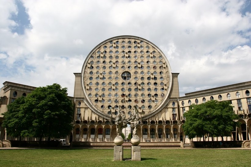 Задумывался он как некая аналогия античного театра — с палаццо, аркой и полукруглым театром. Само собой, все сектора жилые,включая «арку», в которой размещено 20 квартир. Весь комплекс производит совершенно фантастическое впечатление на зрителя, недаром это место «облюбовано» режиссерами-антиутопистами.