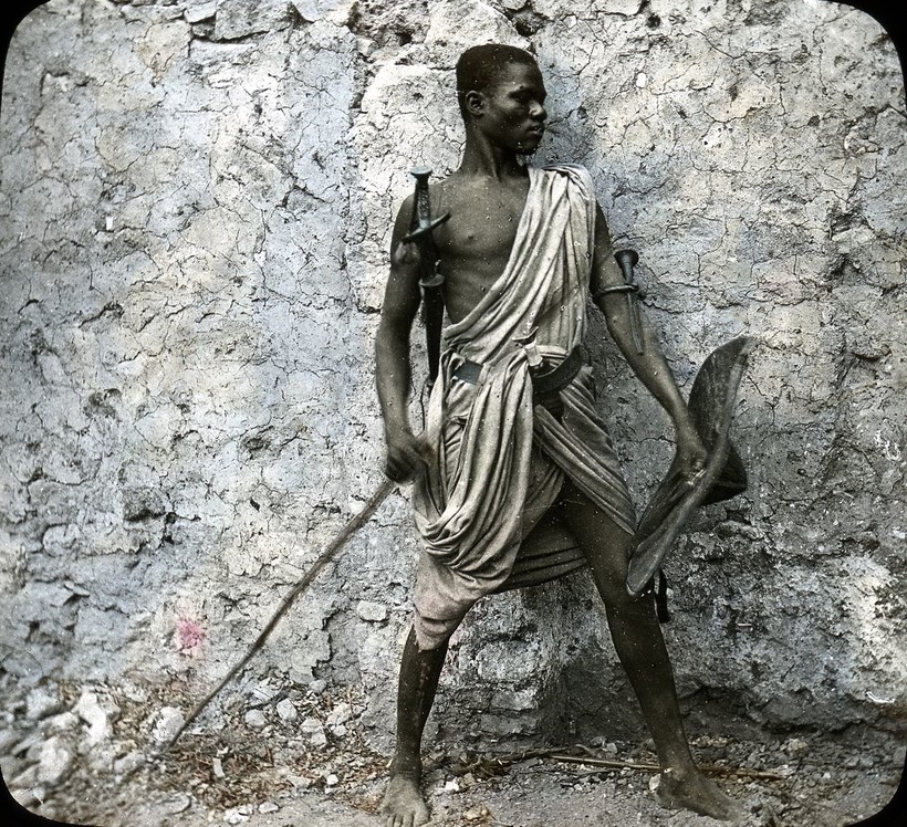В 19 веке Нубия еще была частью Египта. Здесь вы видите молодого человека, противостоящего воинам нубийцам.