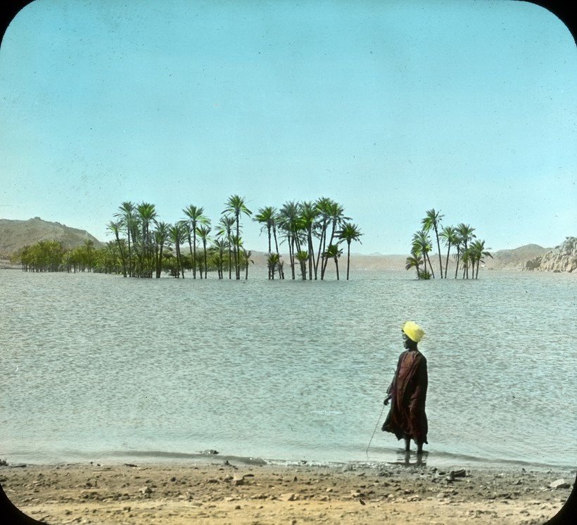 Маленький мальчик стоит в реке Нил, на голове у него желтая чалма. Это снимок 1908 года. В то время воду контролировала еще старая Асуанская плотина, которая, как правило, не справлялась со всей массой воды.