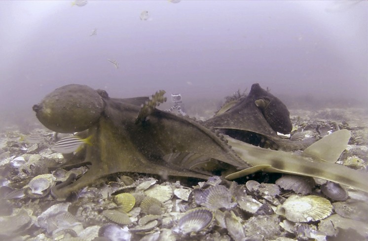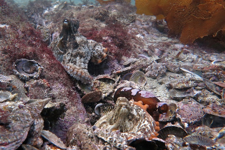 Это волшебное место построено из опустошенных раковин моллюсков и гребешков, коллекции рыболовных приманок и пивных бутылок. Именно здесь и обитают осьминоги. Хотелось бы написать «в мире и согласии», но на самом деле стычки между ними происходят периодически. Однако все равно они держатся вместе. Около 10-15 осьминогов сигнализируют друг другу об опасности, спариваются и защищают товарищей и территорию, деля один район.