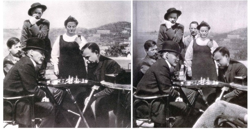 Первое фото было сделано в 1908 году. Отретушированная версия появилась в 1939 году: кропотливыми усилиями художников из кадра убрали женское колено, а также революционера Пешкова, он же Свердлов.