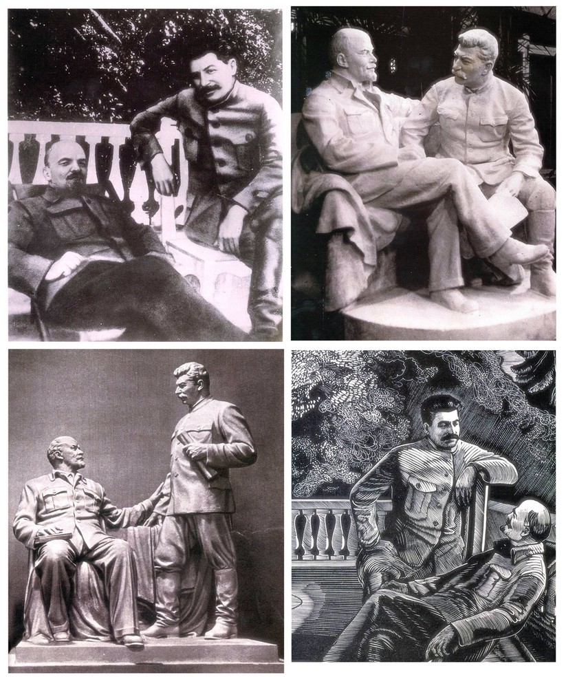 Фальсификация начинается с первого снимка-«Ленин и Сталин в Горках», 1922 год. И уже по его мотивам пропаганда действовала рукой художников и скульпторов. Изначально же снимок является подделкой, которую создали, чтобы продемонстрировать народу близкую дружбу Сталина с Лениным.
