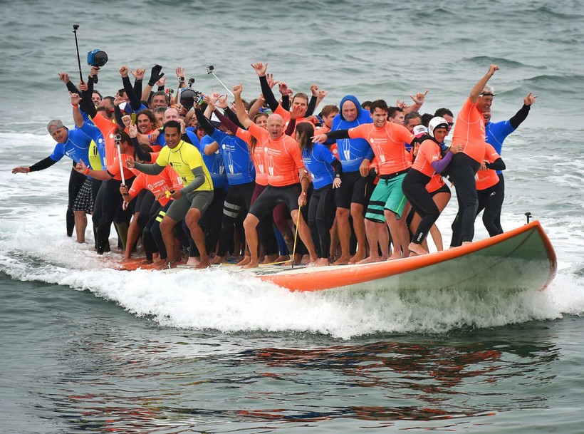 Рекорд был установлен 20 июня 2015 года. 66 серферов встали на огромную доску и отправились ловить волну. Поездка была короткой, но рекордной. 13 секунд. Хантингтон Бич, Калифорния.