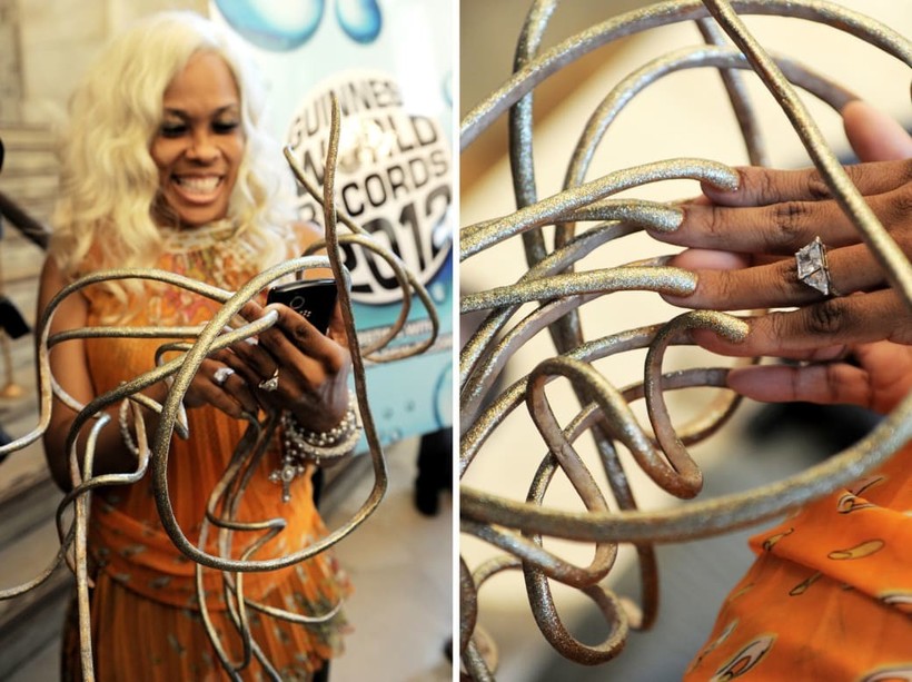 Крис Уолтон попала в Книгу рекордов Гиннесса 14 сентября 2011 года с необычным рекордом — у девушки самые длинные ногти (6,02 метра)! На фото она демонстрирует свое богатство в Публичной библиотеке Нью-Йорка.