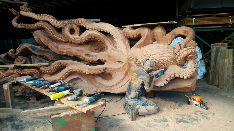 В упавшем дереве большинство из нас видит просто упавшее дерево, но для американца Джеффри Майкла Самудоски это целый мир возможностей. А все потому, что мужчина — художник, главным инструментом которого является... бензопила! Судя по этому гигантскому тихоокеанскому осьминогу, Самудоски может преобразить дерево в самую невероятную скульптуру.