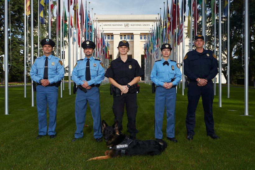Члены сил безопасности ООН позируют перед штаб-квартирой Европейского Союза в Женеве.