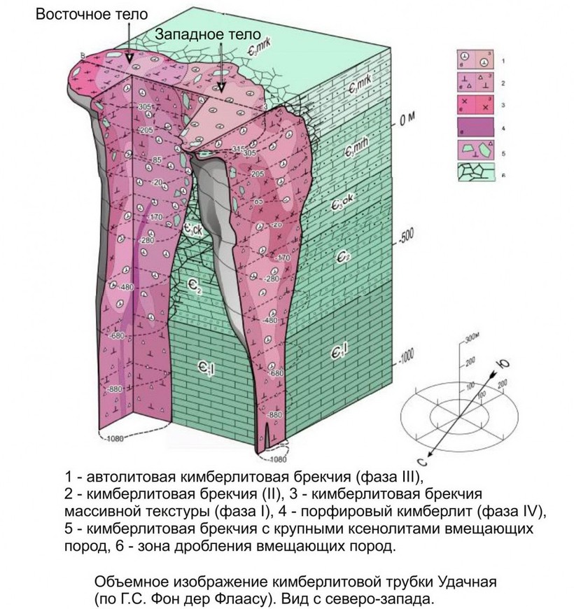 Крупнейшая кимберлитовая трубка в мире, на которой сегодня ведутся работы по добыче алмазов, расположена в Якутии и носит название «Удачная». Если говорить точнее, то это не одна трубка, а две близко расположенные кимберлитовые трубки.