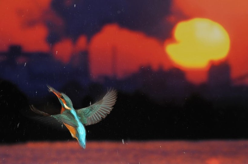 Фотографу удалось запечатлеть зимородка в полете на фоне серьезного загрязнения, вызванного деятельностью многочисленных предприятий на заднем плане.
