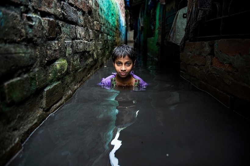 Раджу Гош запечатлел плачевное состояние индийских городов и последствия муссонного климата. Кадр сделан в трущобах Западной Бенгалии (Индия), где мальчик пробирается через переулок, затопленный в результате проливного дождя. В стране недостаточно развита инфраструктура осушения улиц, и конечно, больше всего страдают люди, живущие в трущобах.