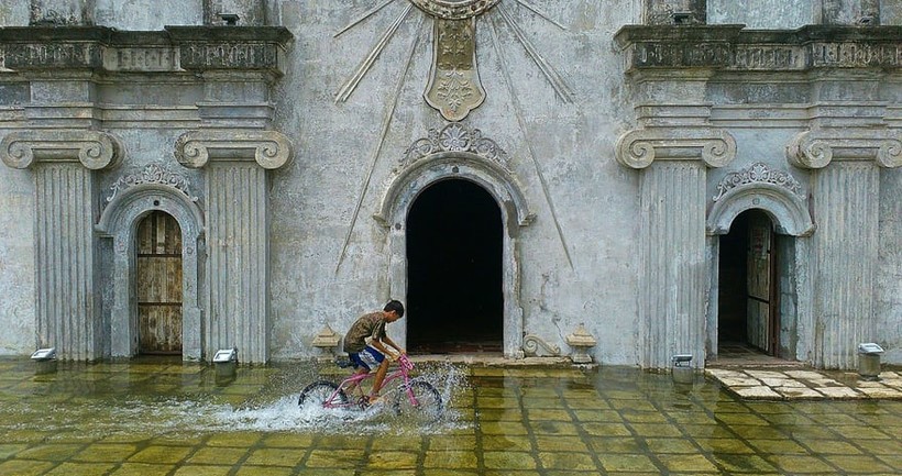 С последствиями муссонных дождей не могут справиться и на Филиппинах. Мальчик катается на велосипеде на затопленной территории перед приходской церковью Сан-Гильермо в Баколор, Пампанга. Несмотря на условия жизни, ребенок радуется последствиям непогоды.