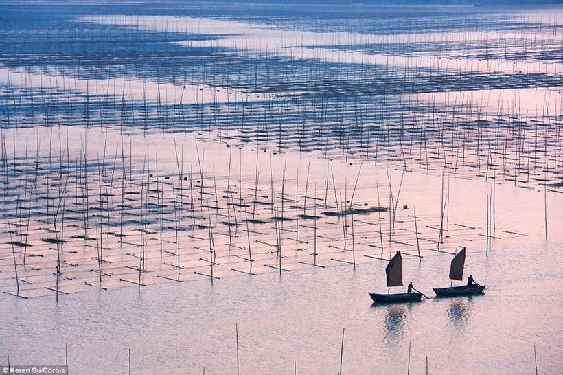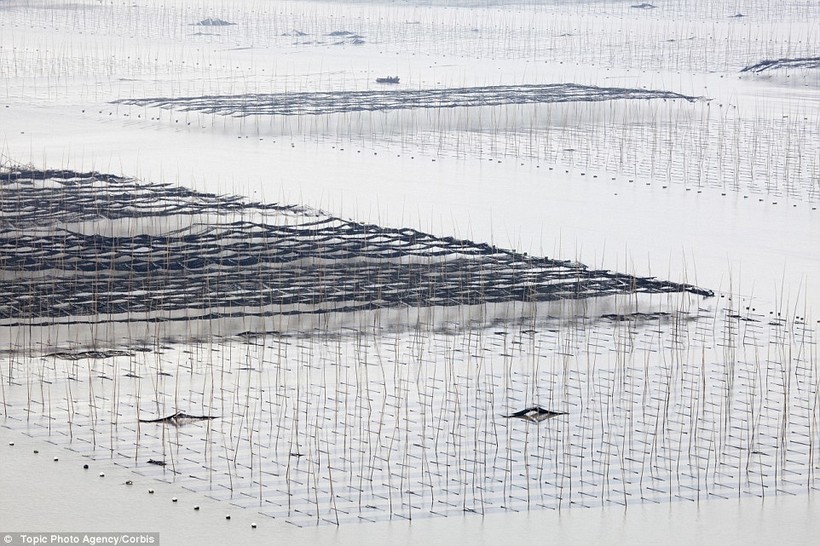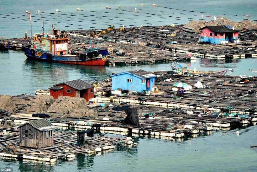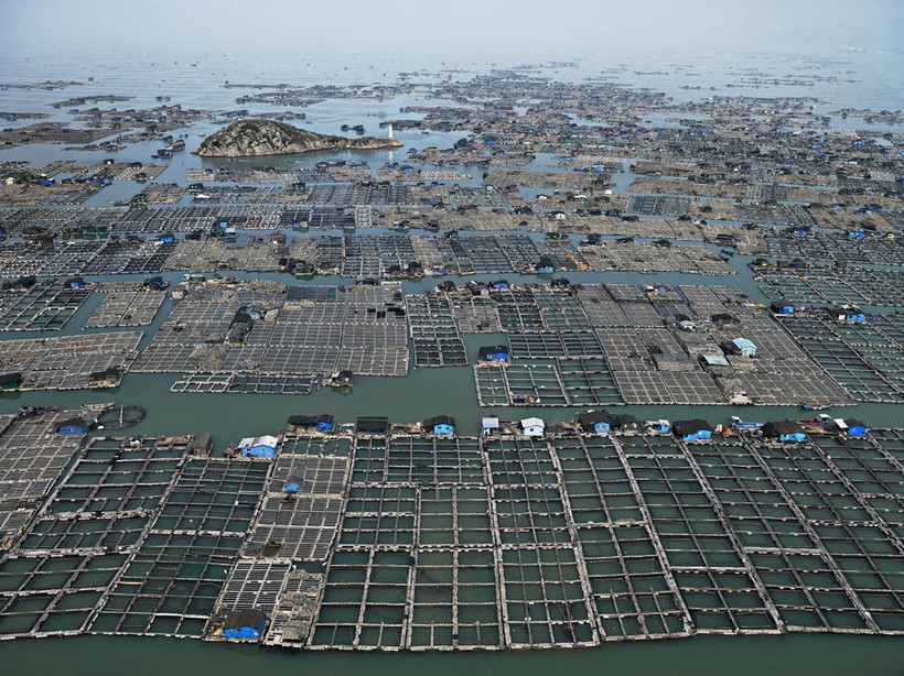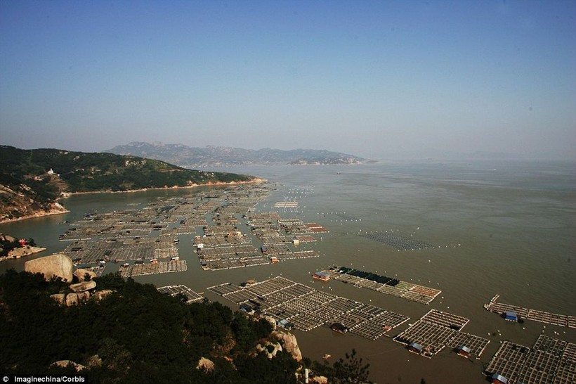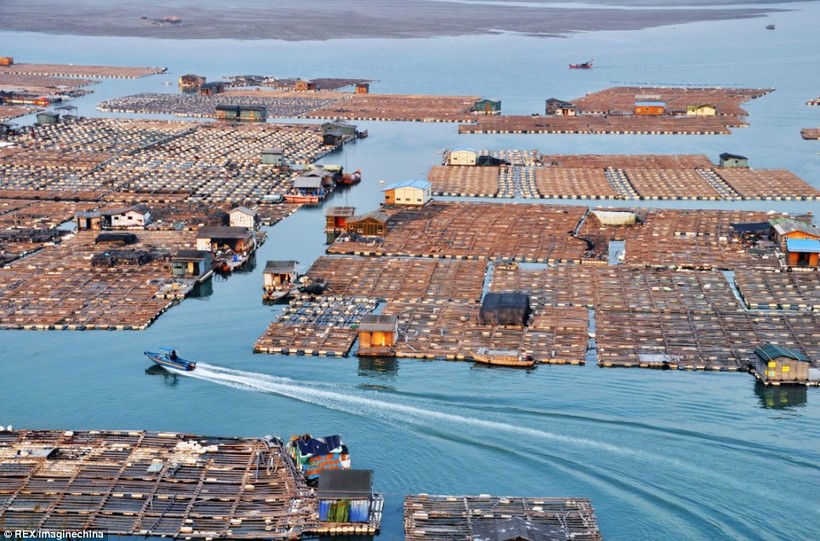 В прибрежных водах Бохайского моря (Китай) выращивают рыбу в огромном количестве. На рыбных хозяйствах растят не только непосредственно рыбу — тут и креветки, и моллюски, и устрицы.