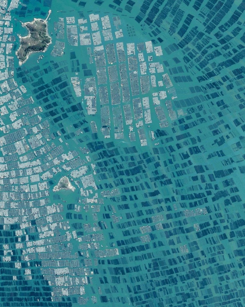 Плавучие фермы — это целая разветвленная сеть связанных сетчатых полотен, которые соединены на поверхности воды деревянными мостиками и платформами.
