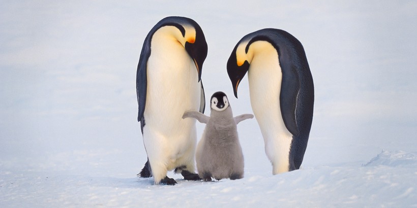 Интересен и тот факт, что пингвины поочередно в равной степени ухаживают за потомством. Высиживанием и согреванием вылупившихся птенцов занимаются как самки, так и самцы, у которых на теле для этого предусмотрена специальная сумка. Когда самки уходят в море на поиски пропитания, а это может продолжаться до 3-х месяцев, самцы остаются с яйцами или с уже вылупившимися детенышами и голодают все это время, теряя до 30% массы тела. И лишь после возвращения мам они отправляются на поиски пропитания. Вот такое потрясающее самопожертвование.