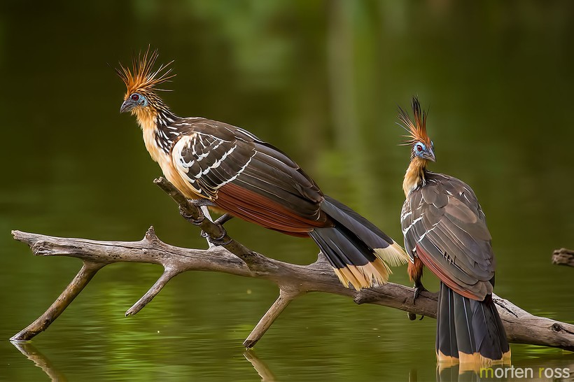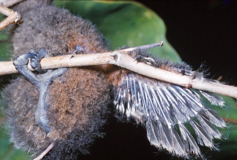Зато сохранилась другая не менее интересная птица, которая также обладает некоторыми особенностями своих предков, что делает ее живым доказательством происхождения птиц от древних рептилий. Это гоацины, которые обитают в вечнозеленых лесах Южной Америки на территории Колумбии и Боливии. Внешний вид их немного необычен и чем-то напоминает сказочных птиц. Но самое интересное — это строение крыльев. Когда рождаются птенцы гоацинов, они имеют когтистые пальцы на концах передних конечностей. В случае опасности они проворно выбираются из гнезда и спасаются бегством, цепляясь всеми четырьмя лапами за ветки. То есть они пользуются недоразвитыми крыльями как лапами, точно так же, как это делают пресмыкающиеся. В молодом возрасте эти птички также отлично плавают. Но по мере взросления они теряют способность к перемещению по воде, их крылья обрастают перьями и они уже не могут карабкаться по веткам, цепляясь пальцами.