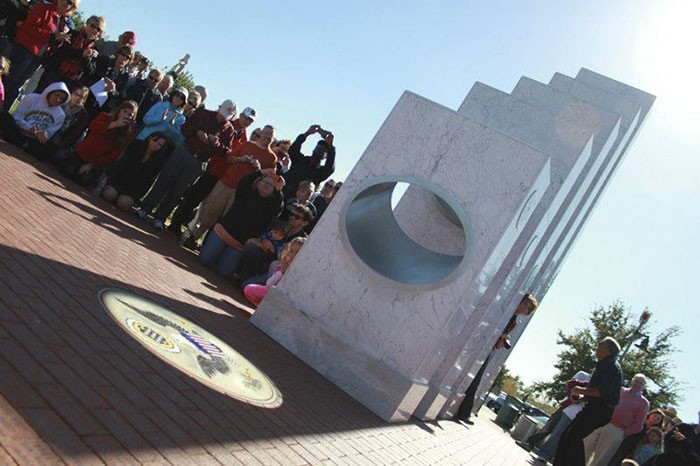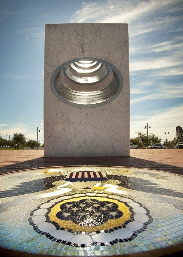 «Каждый год в День ветеранов (11 ноября) ровно в 11:11 утра лучи солнца проникают через эллипсы пяти столбов мемориала и формируют идеальное солнечное освещение точно над мозаикой Великой Печати Соединенных Штатов, — говорится в заявлении общинного совета города. — Пять столпов представляют собой единство пяти ветвей вооруженных сил США, которые непоколебимы вместе». К ним относится армия, морская пехота, военно-морской флот, военно-воздушные силы и береговая охрана США.